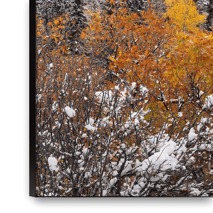 Kunstdruck eines stürmischen Tages über dem Mount Sneffels in den San Juan Mountains mit herbstlich gefärbten Stieleichen im Vordergrund.