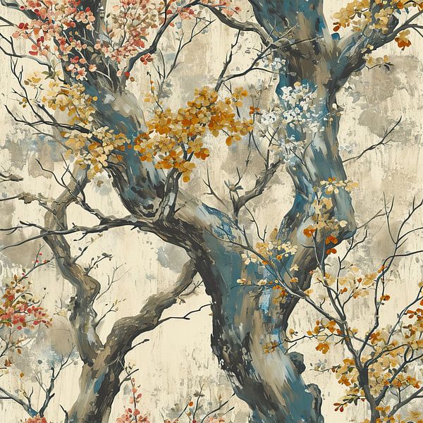 Natural Blossoms | Blossom Painting - Wir sehen eine bezaubernde Synergie der Natur mit einer stilvollen Wendung, bei der sich gewundene Baumzweige elegant vor einem strukturierten Hintergrund erstrecken. Die leuchtenden und doch subtilen Orange- und Gelbtöne der Blüten kontrastieren wunderschön mit den Grau- und Blautönen. So entsteht…