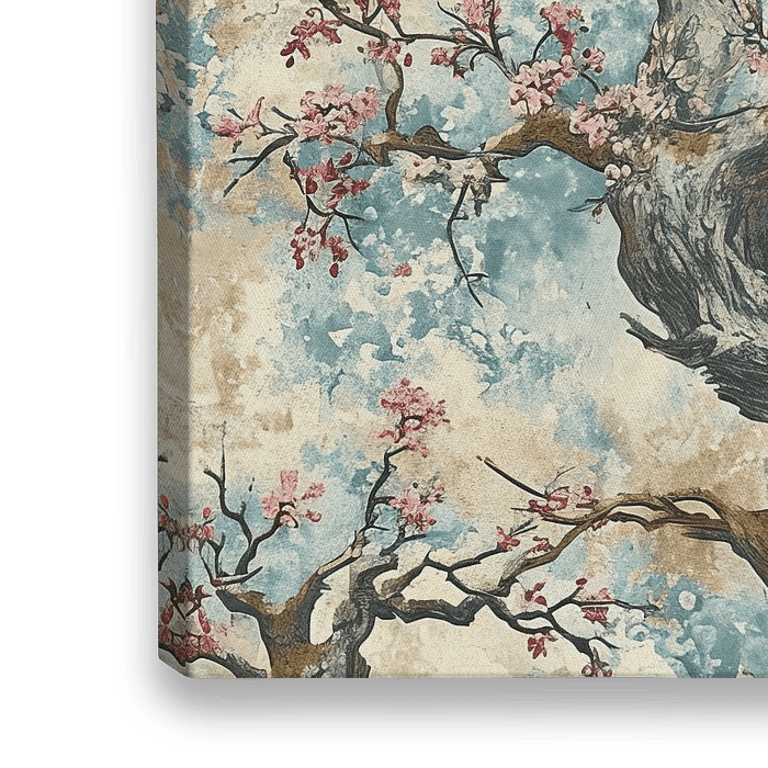Natural Floral Art - Dieses raffinierte Leinwandbild bringt Ihnen mit seiner detaillierten Darstellung eines blühenden Kirschbaums die Heiterkeit der Natur näher. Die subtil ausgewogene Mischung aus sanftem Blau und warmen Beigetönen im Hintergrund unterstützt die organische Palette aus Braun- und Rosatönen auf wunderbare Weise und…