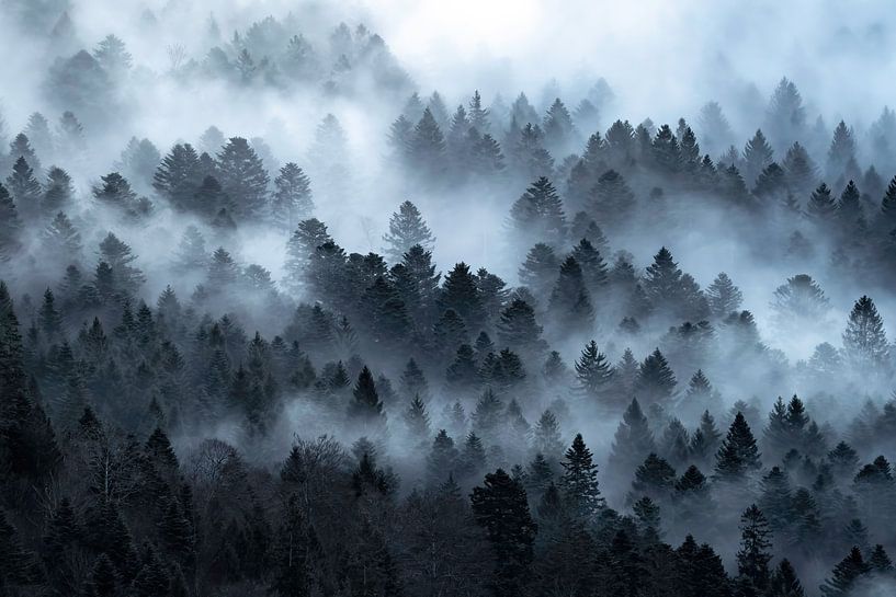 Bestelle dieses Landschafts-Wandbild Nebel in bewaldetem Berghang von Sam Mannaerts als Reproduktion auf Leinwand, Alu-Dibond, als Poster, Fototapete oder Acrylglasbild.