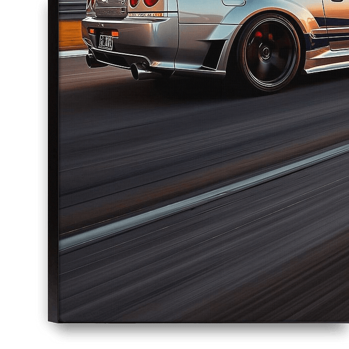 Bestelle das Foto Nissan GT-R R34 Sonnenuntergang von MIROKKU als Reproduktion auf Leinwand, Alu-Dibond, als Poster, Fototapete oder Acrylglasbild.