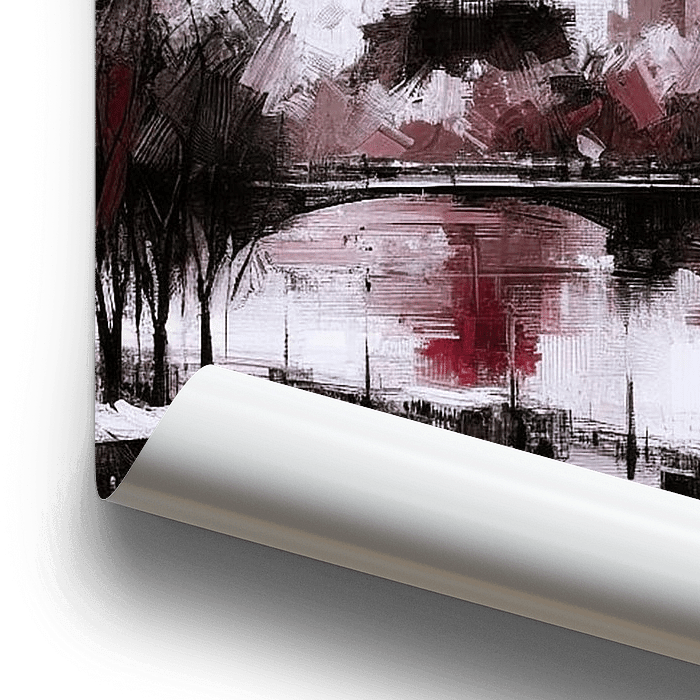 Farbvariante mit Dunkelrot. Romantische Skyline Ansicht von Paris, abstrakt und pasteus gemalt. An der Seine und natürlich mit Eifelturm. Moderne Mischtechnik, digital erstellt. ©12/2024 by Pia Schneider, atelier COLOUR-VISION