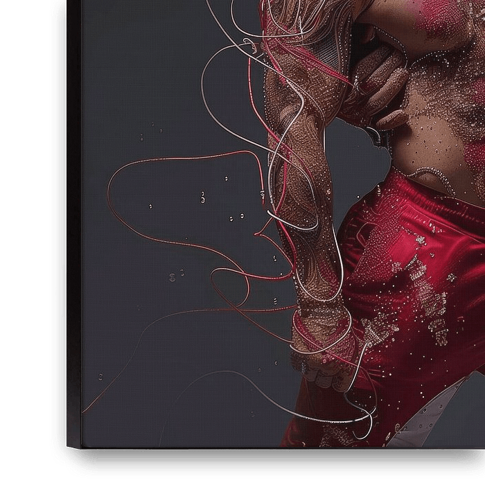 Stel je voor: een explosief kunstwerk dat de kracht en passie van twee bodybuilders vastlegt die een parendans uitvoeren, half naakt en schaars gekleed in vurige rode en pure witte tinten. Tegen een neutrale grijze achtergrond komt de energie van dit dynamische duo volledig tot leven, en elke beweging straalt intensiteit en emotie…