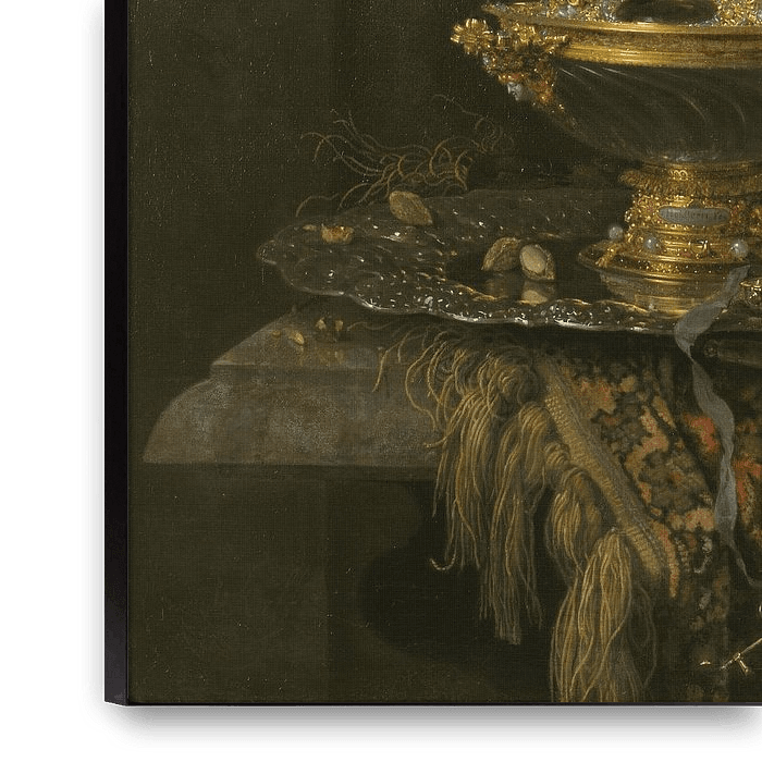 Bestelle Pronk-Stillleben mit Holbein-Schale, Nautilus-Becher, Glaspokal und Obstschale, Willem Kalf als Reproduktion auf Leinwand, Alu-Dibond, als Poster, Fototapete oder Acrylglasbild.