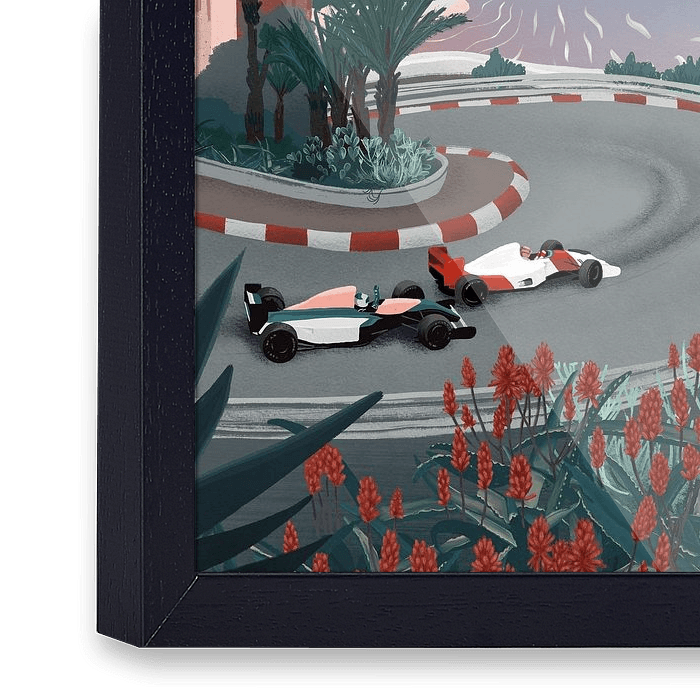 Zeichnung der Rennstrecke von Monaco, mit Blick auf die Stadt, das Meer und zwei Formel-1-Autos.