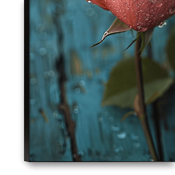 Dieses bezaubernde Bild zeigt eine einzelne rosafarbene Rose, die vor Tau trieft und zarte Schönheit und Neuanfang symbolisiert. Der zarte rosa Farbton der Blume bildet einen schönen Kontrast zu dem verwitterten türkisfarbenen Hintergrund und vermittelt ein Gefühl von zeitloser Eleganz. Perfekt, um einen Hauch von Romantik und Ruhe in…