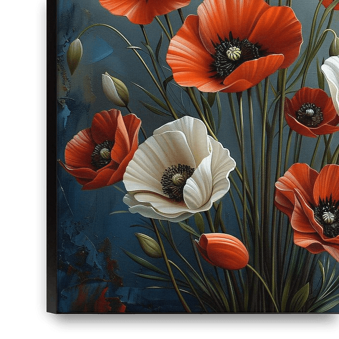 Dieses Gemälde zeigt eine schöne Ansammlung von roten und weißen Blumen vor einem ruhigen blauen Hintergrund. Die subtilen Kontraste und feinen Details der Blütenblätter laden den Betrachter zu einem längeren Betrachtungserlebnis ein. Dieses Kunstwerk ist ideal für alle, die ihre Innenräume mit einem Hauch von natürlicher Schönheit…