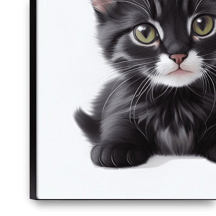 "Velvet Gaze" ist eine wunderschöne Darstellung von Unschuld und Neugier, eingefangen in den Augen eines jungen Kätzchens. Dieses hyperrealistische Kunstwerk mit monochromem Hintergrund verstärkt die Wirkung der grünen Augen und der rosa Nase vor dem kontrastierenden schwarzen und weißen Fell. Ideal für einen weichen Look im…