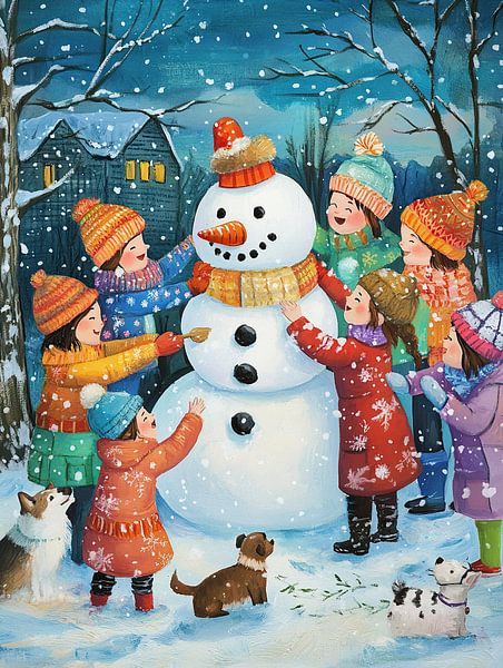 Schneemann | Schneespaß - Dieses winterliche Kindergemälde zeigt eine Gruppe fröhlicher Kinder, die draußen im Schnee einen großen Schneemann bauen, gekleidet in bunte Winterkleidung, umgeben von verspielten Hunden unter einem verschneiten Himmel.