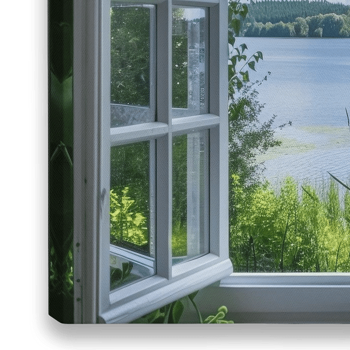 Genießen Sie die beruhigende Aussicht auf einen idyllischen See durch ein geöffnetes Fenster. Das ruhige Wasser und das üppige Grün der Umgebung schaffen eine entspannende Atmosphäre, die perfekt für Naturliebhaber und Menschen ist, die Ruhe und Gelassenheit suchen. Ideal für Wohnzimmer, Schlafzimmer oder Büro, bringt dieses Bild eine…