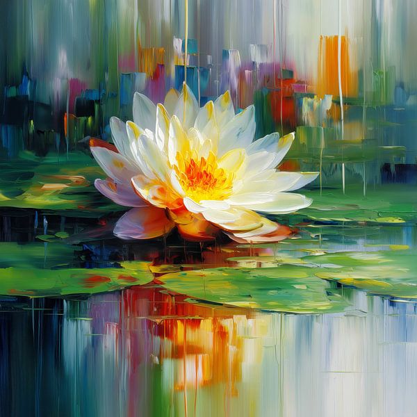 Dieses ausdrucksstarke Wandbild zeigt eine leuchtende Seerose inmitten ruhigen Wassers, umgeben von intensiven Farben und sanften Reflexionen. Die Kombination aus natürlicher Form und abstrakter Malweise verleiht dem Motiv eine besondere Tiefe und emotionale Wirkung.