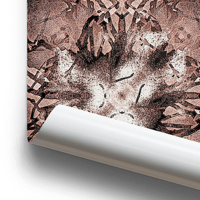 Ein abstraktes kaleidoskopisches Bild in Braun- und Weißtönen, basierend auf einem Winterfoto von mit frischem Schnee bedeckten Ästen.