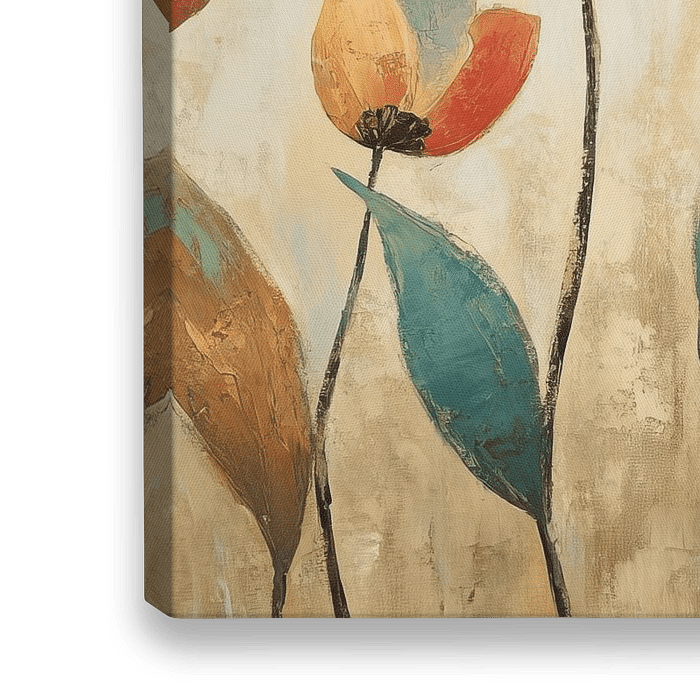 Sommerblumen | Bunte Blumen - Dieses Blumenbild zeigt lebendige, stilisierte Blumen in warmen Rot-, Orange- und Gelbtönen vor einem weichen, neutralen Hintergrund, der einen verspielten und einladenden Eindruck macht.