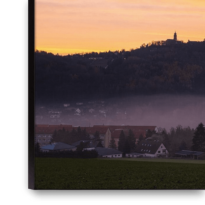 Sonnenaufgang am Nikloaustag von Erdmannsdorf aus in Richtung Augustusburg. Leichter Nebel zieht durch das Tal.