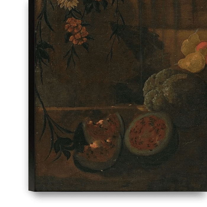 Über „Stillleben mit Blumen, Früchten und Vögeln inmitten von Ruinen, Lombardschule“