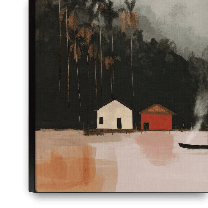 Dieses stimmungsvolle Kunstwerk fängt die heitere Schönheit des surinamischen Flusslebens ein. Die farbenfrohen Häuschen am Ufer, umgeben von sich wiegenden Palmen und sanftem Nebel über dem Regenwald, strahlen Ruhe und Authentizität aus. Auf dem Fluss gleiten traditionelle Boote vorbei, ein subtiler Hinweis auf das tägliche Leben, das…