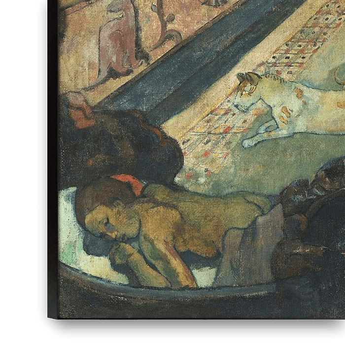Te Rerioa, Paul Gauguin (1897) Paul Gauguin malte dieses beeindruckende Werk einige Jahre nach seiner Niederlassung auf Tahiti, einer französischen Kolonie im Südpazifik, und nur wenige Wochen nach Nevermore. Die beiden Gemälde reisten mit demselben Schiff nach Frankreich, wo sie von Gauguins Kunsthändler verkauft wurden. Der Künstler gab an, Te Rerioa in weniger als zehn Tagen gemalt zu haben, wobei er eine Verzögerung bei der Abfahrt des Schiffes ausnutzte. Die sorgfältig konstruierte Komposition, ihre Feierlichkeit und Ausgewogenheit lassen jedoch auf ein völlig spontanes Unterfangen schließen. Tatsächlich war Te Rerioa das letzte einer Reihe ehrgeiziger Gemälde, die Gauguin in den vorangegangenen Monaten gemalt hatte. Te Rerioa zeigt zwei Frauen, die in einem mit kunstvollen Holzreliefs verzierten Raum über ein schlafendes Kind wachen. Über die symbolische Bedeutung der Schnitzereien - ein sich umarmendes Paar, hybride Kreaturen und Vegetation - wurde viel spekuliert, aber wie die Beziehung der Frauen hat Gauguin sie absichtlich unklar gelassen. Er nannte das Gemälde Te Rerioa (was auf Tahitianisch "Traum" oder "Alptraum" bedeutet) und schrieb an einen Freund: "Auf dieser Leinwand ist alles ein Traum, sei es das Kind, die Mutter, der Reiter auf der Straße oder der Traum des Malers".