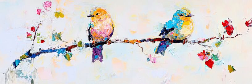 Auf einem zarten Ast, umgeben von filigranen Blüten, sitzen zwei bezaubernde Vögel, deren lebendige Farben in sanften Pastelltönen erstrahlen. Ihre sanften, neugierigen Blicke scheinen eine Geschichte zu erzählen, während der Frühling mit jedem Pinselstrich lebendig wird. Das Zusammenspiel von Licht und Schatten verleiht der Szenerie…