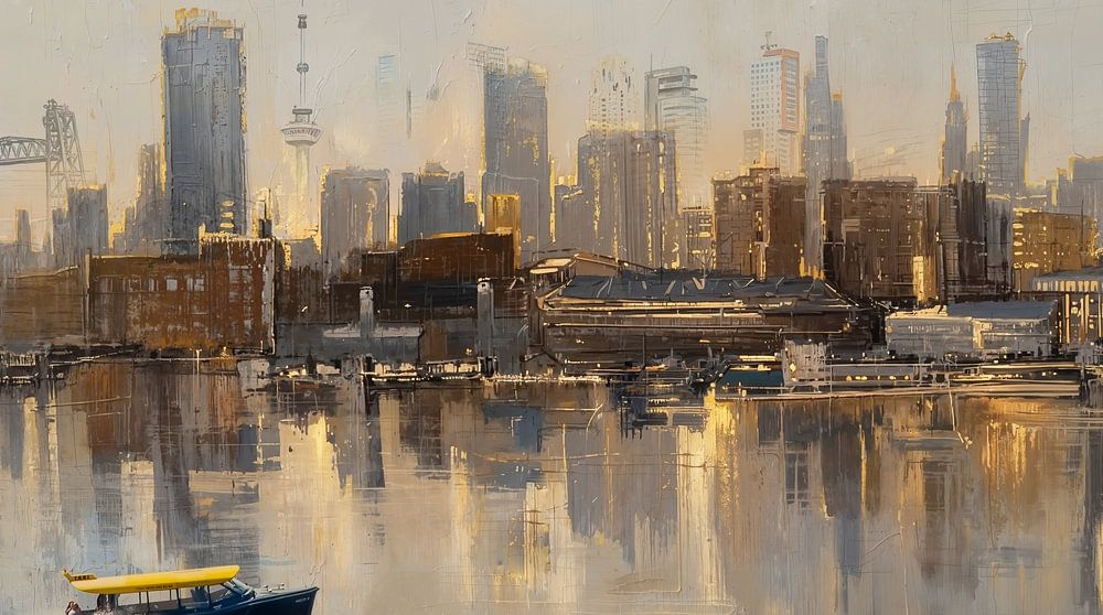 Wassertaxi in der gemalten Skyline von Rotterdam ist ein Gemälde, in dem die Stadt nicht buchstäblich abgebildet, sondern imaginär ist. Dieses Kunstwerk zeigt eine fiktive Skyline von Rotterdam, in der sich Wasser, Architektur und Atmosphäre zu einem ruhigen und zeitgenössischen Stadtbild vereinen. Es handelt sich nicht um eine…