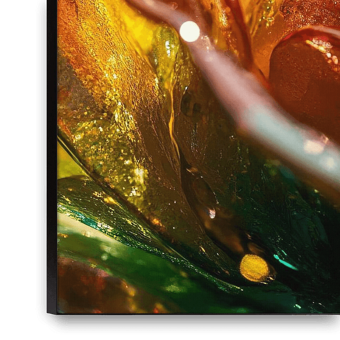 Eine bezaubernde Nahaufnahme einer Kristallrose mit funkelnden Details. Das Funkeln des Lichts auf den gläsernen Blütenblättern schafft eine magische Atmosphäre. Perfekt als dekoratives Kunstwerk für jeden modernen Raum. Diese Komposition vereint Eleganz und Farbe und verleiht Ihrem Interieur einen Hauch von Luxus.