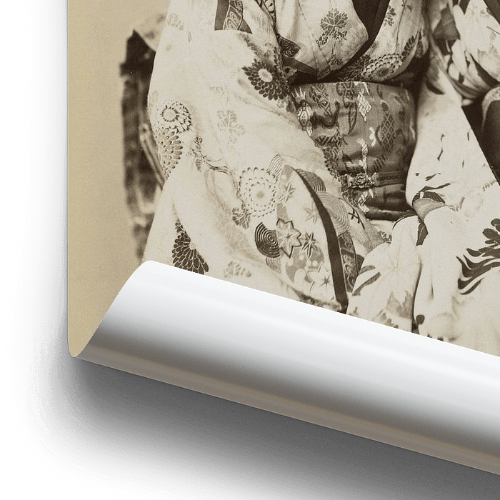 Bestelle dieses Porträt Zwei japanische Mädchen in Kimonos. Vintage-Foto in schwarz-weiß. von Dina Dankers als Reproduktion auf Leinwand, Alu-Dibond, als Poster, Fototapete oder Acrylglasbild.