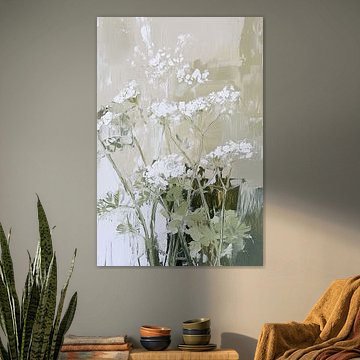 Wiesenkerbel in Grüner HarmonieDieses abstrakte Werk fängt die zarte Eleganz des Wiesenkerbels in einer ruhigen, harmonischen Komposition ein. Mit dem Palettenmesser wurden schlanke, grüne Stiele kraftvoll, aber raffiniert dargestellt. Sie ragen leicht und rhythmisch empor, als würden sie sanft von einer unsichtbaren Sommerbrise bewegt. Die weißen Blütenbüschel schweben wie kleine Lichtakzente über dem Grün – subtil, luftig und fast transparent in ihrer Präsenz. Der Hintergrund besteht aus sorgfältig aufgetragenen Flächen in Beige, Cremeweiß, Olivgrün, Moosgrün und Grasgrün. Diese Farbtöne fließen ineinander und bilden zusammen ein warmes, natürliches Bett für das Linienspiel der Zweige. Das Palettenmesser sorgt für eine spürbare Struktur: hier und da robust und vielschichtig, aber immer mit einem raffinierten Finish, das Ruhe und Ausgewogenheit ausstrahlt. Die komplementäre Wirkung zwischen den Zweigen und dem Untergrund verstärkt die Harmonie im Gemälde. Das frische Grün der Stiele kontrastiert subtil mit den sanfteren Erdtönen im Hintergrund und schafft so Tiefe und Bewegung, ohne die Ruhe zu stören. „Fluitekruid in Groen Harmonie” strahlt Stille, Weite und natürliche Eleganz aus. Es ist eine Ode an die Einfachheit von Feldblumen, übersetzt in abstrakte Formen und Texturen, die sowohl modern als auch zeitlos wirken. Ein Werk, das Ruhe bringt, aber gleichzeitig durch seine vielschichtige Struktur und sein raffiniertes Farbenspiel fasziniert. von Bianca ter Riet