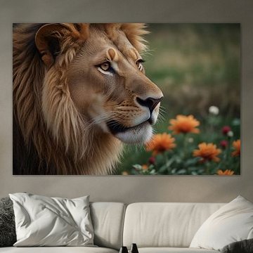 Nachdenklicher Löwe in einem Blumenfeld von Art & Soul Creations