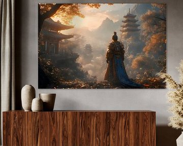"Ein einsamer alter Krieger steht an einem glühenden Herbstberghang und überblickt die nebelverhangenen kaiserlichen Tempel während eines goldenen Sonnenuntergangs. Er fängt einen Moment der stillen Bestimmung, der Ehre und der Reflexion zwischen Schicksal und Tradition ein." von Pratomo Wisuda