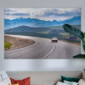 Auto (Volvo Amazon) durch die Berge in Kirgisistan von Geja Kuiken