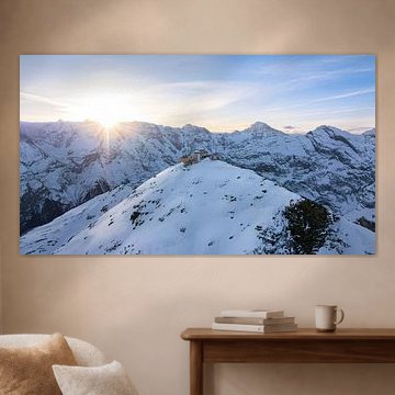 Warme Erdtöne wie Taupe, Braun und Terrakotta prägen viele Motive dieser Kollektion. Diese Farben harmonieren wunderbar mit kühlen Blautönen in Textilien oder Möbeln. Ein gutes Beispiel dafür ist Wilder Kaiser Sunrise, dessen goldenes Licht schön mit grauen oder blauen Akzenten im Raum wirkt.