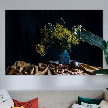 Stilleben einer blau-grünen Vase mit gelben Blumen auf goldfarbener Leinwand. von Marianne van der Zee