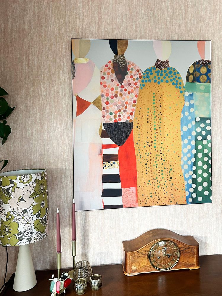 Das Quadratformat bringt die vielschichtigen Details von Collagen besonders schön zur Geltung. Die ausgewogene Form eignet sich perfekt über einem Sideboard, im Flur oder neben dem Bett - überall, wo du einen harmonischen Blickfang schaffen möchtest. Das Quadrat gibt den verschiedenen Ebenen und Farben Raum, ohne dass eine Richtung dominiert. Suchst du etwas für eine längliche Wand? Dann wähle das Querformat - es streckt den Raum optisch und sorgt für mehr Weite.