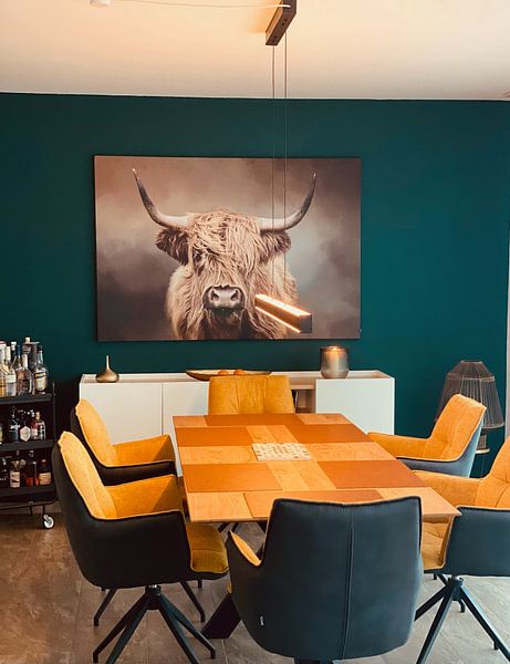 Hänge Tierporträts auf Augenhöhe, damit du den direkten Blick der Tiere auf dich wirken lässt. Das schafft eine besondere Verbindung im Raum. Bei frontalen Motiven wie Schottischer Hochlandbewohner entsteht so eine starke Präsenz - ideal für Flure oder an der Wand gegenüber der Sitzecke.