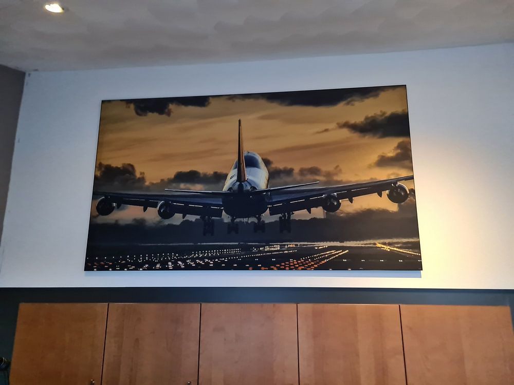 Flugzeugmotive mit ruhiger Ausstrahlung passen gut ins Arbeitszimmer oder in den Eingangsbereich - Orte, an denen du Konzentration und Klarheit schätzt. Die nostalgische Schwarz-Weiß-Aufnahme in super constellation fügt sich zum Beispiel gut in ein reduziert eingerichtetes Büro mit klaren Linien ein.