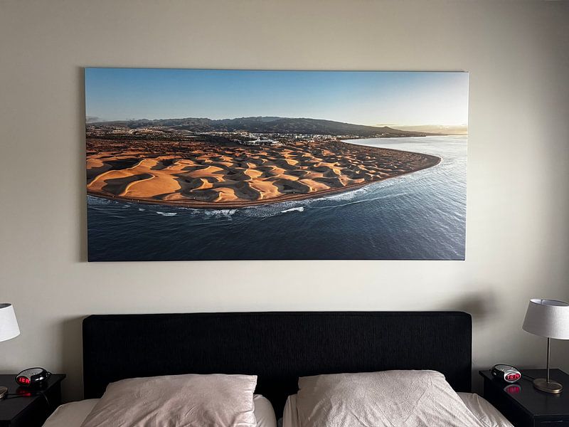 Motive mit sanften Türkis- und Beigetönen aus der Vogelperspektive eignen sich besonders gut für ruhige Rückzugsorte. Hänge Las Dunas Corralejo, Fuerteventura im Schlafzimmer auf - die weichen Farben und der klare Blick auf Küste und Wasser schaffen eine entspannte Atmosphäre, die zur Erholung einlädt.